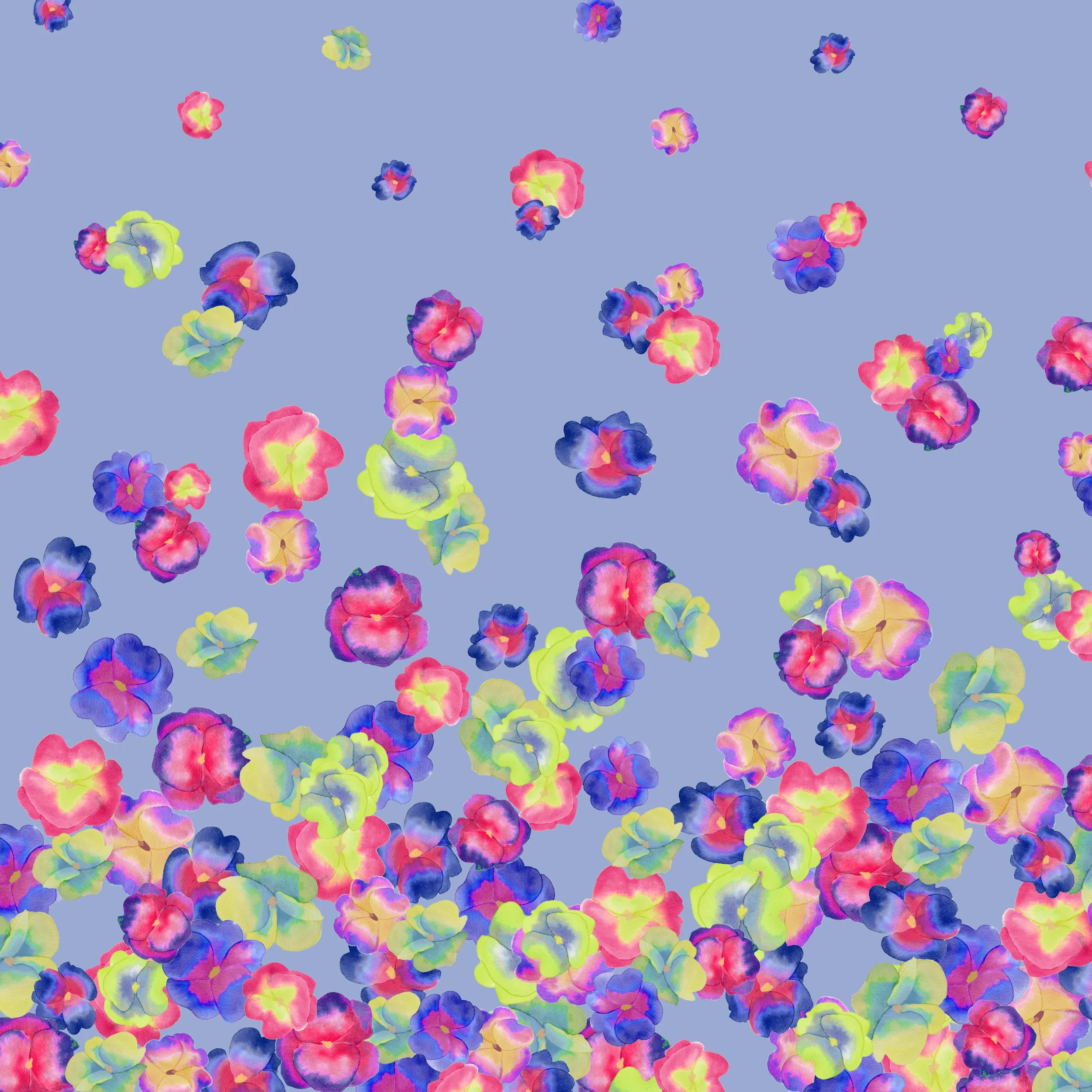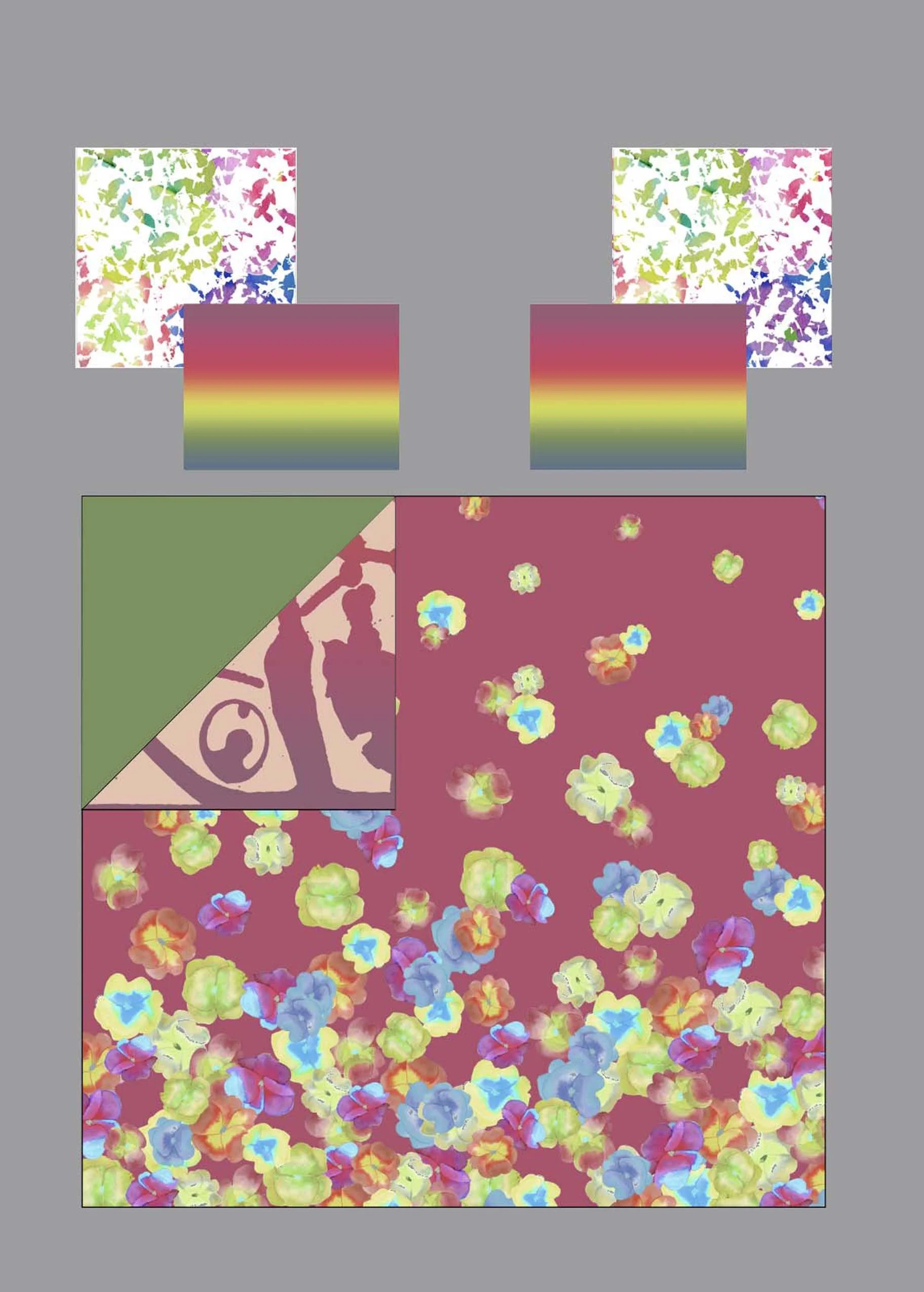 The collection takes a varied approach to design from hand painted impatiens to utilizing tulip petals as a paint brush to mark making with leaves and house items, the paintings were scanned into Photoshop and digitally manipulated.